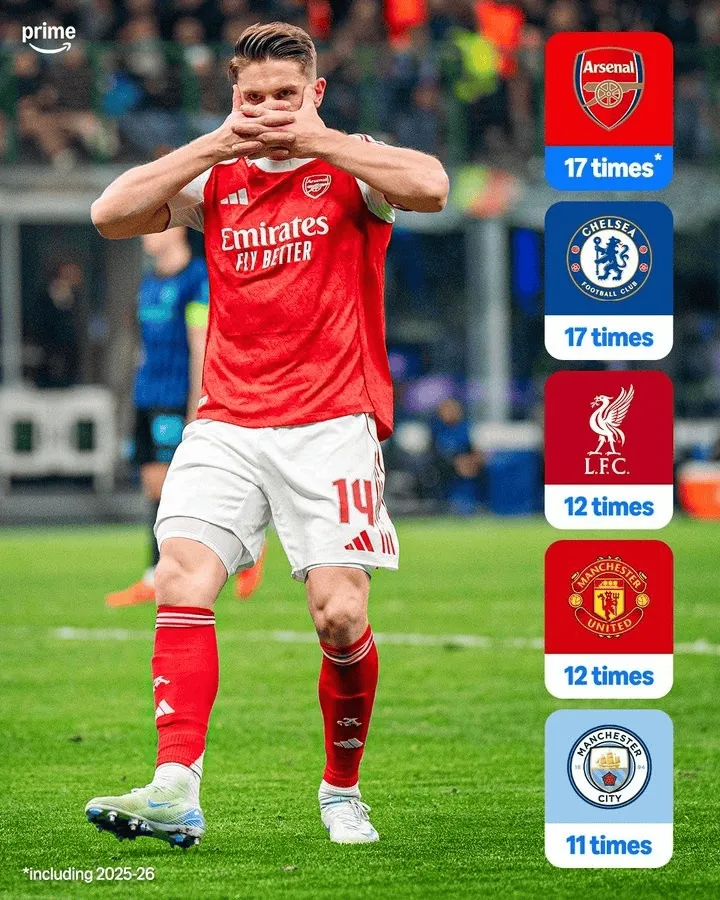 1、阿森纳、切尔西,17次